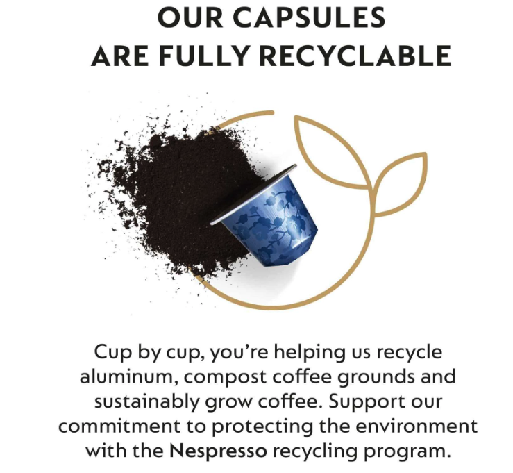 - SUSTAINABILITY: As a certified B Corporation, Nespresso meets the highest standards of verified social and environmental performance, joining a global movement using business as a force for good. Pods made of at least 80% recycled aluminium, a material which is infinitely recyclable.